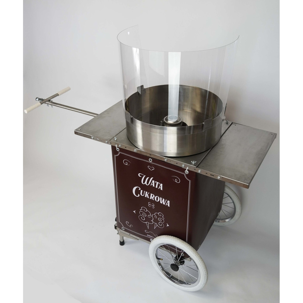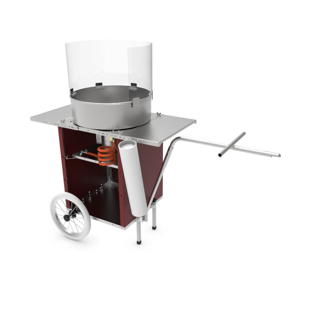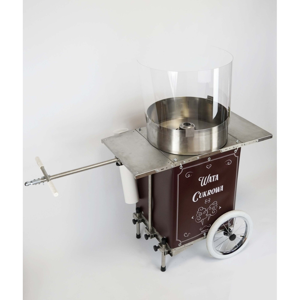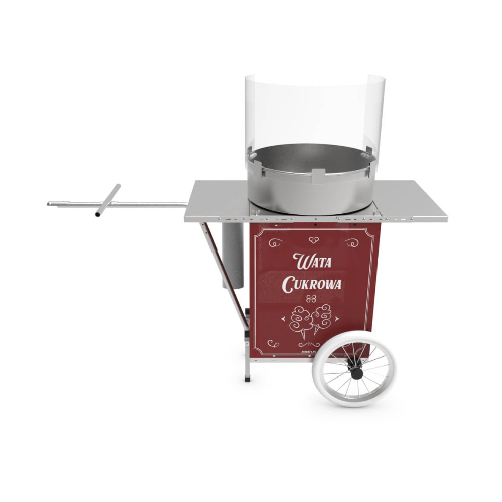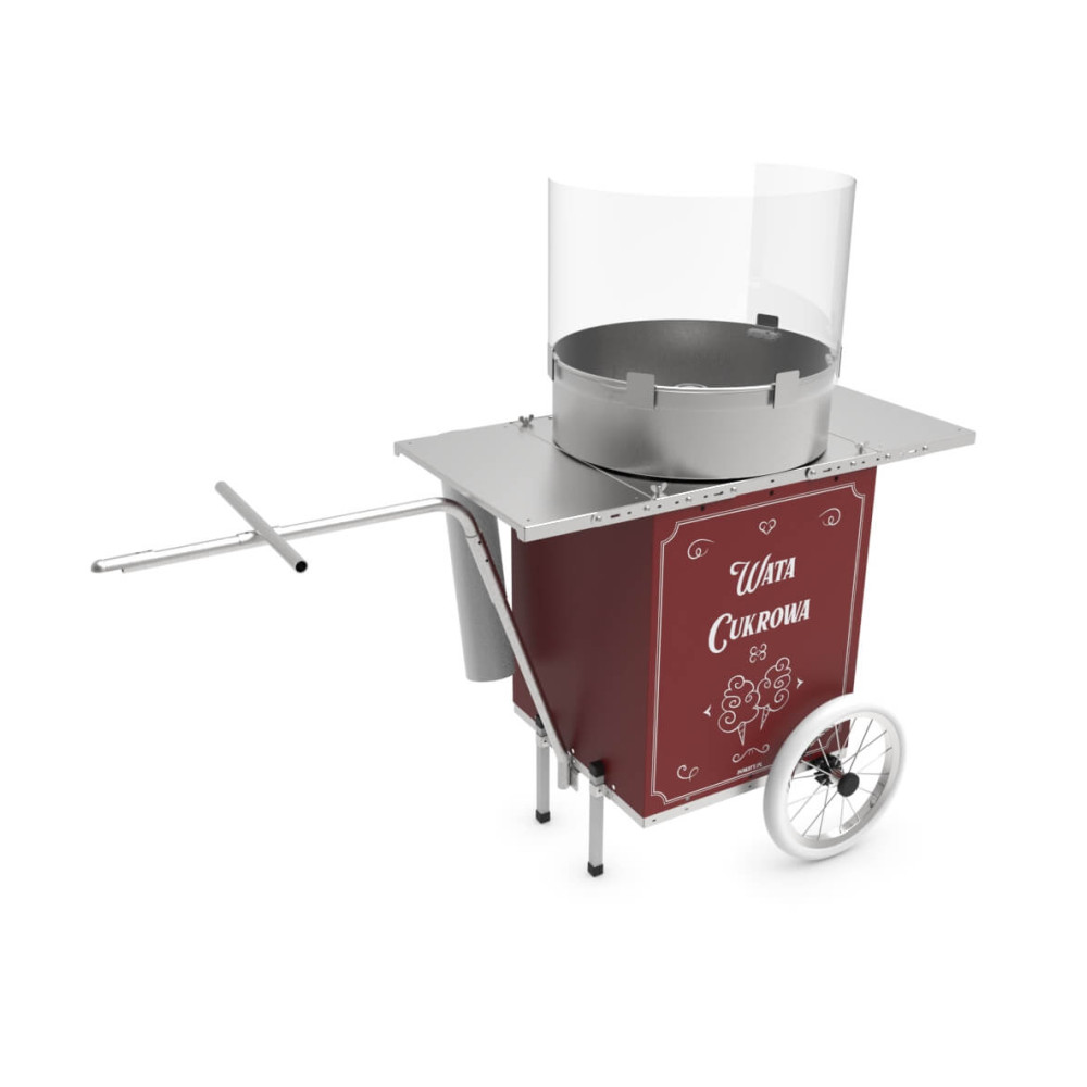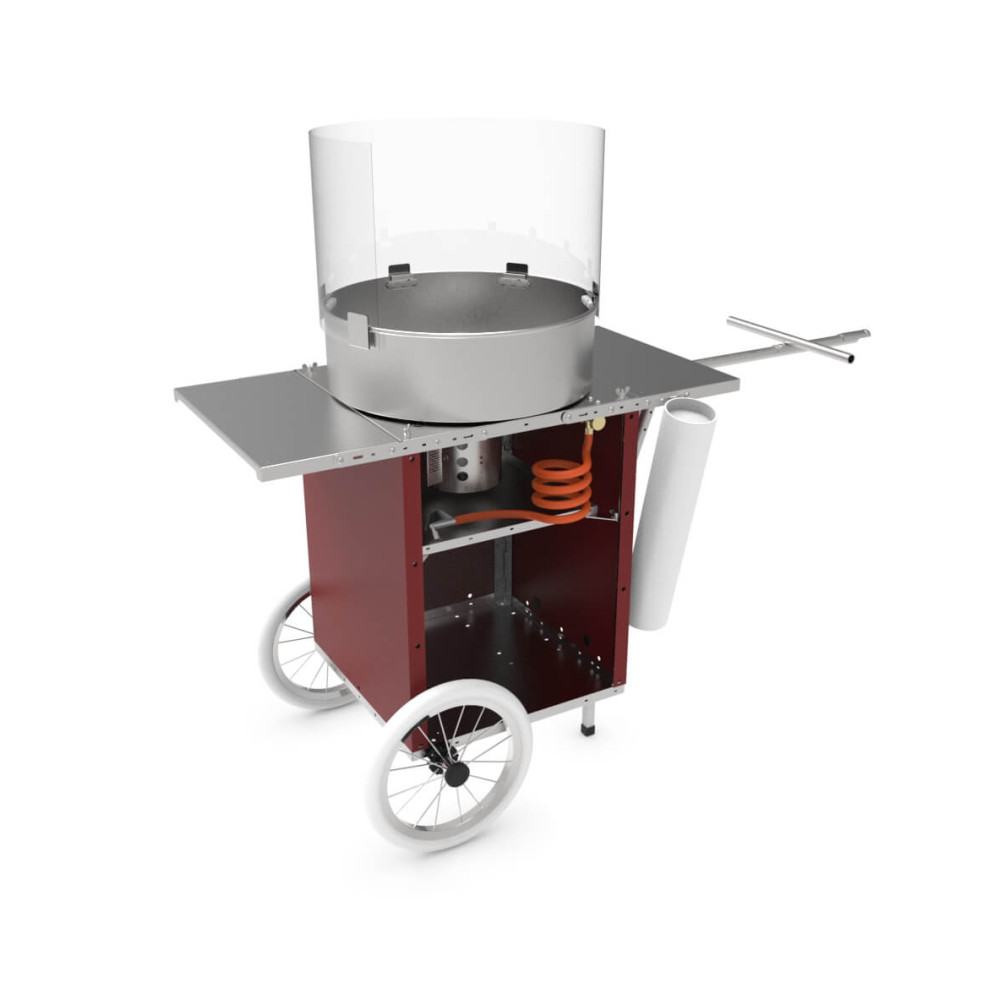 Gazowa maszyna do waty cukrowej zasilana 12V lub 230V. Nie potrzebujesz dodatkowego stołu, aby zacząć sprzedaż, kółka ułatwiają transport złożonej maszyny.