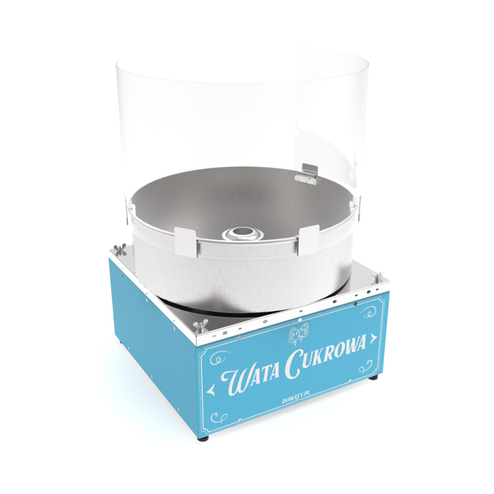 Stołowa maszyna do waty cukrowej w stylu retro, w kolorze niebieskim. Niezwykle stylowy design nawiązujący do lat 50 i 60 ubiegłego wieku. Model bardzo praktyczny, zwarty w jedną, poręczną bryłę. W pełni rozkładalny przy pomocy jednego śrubokręta.