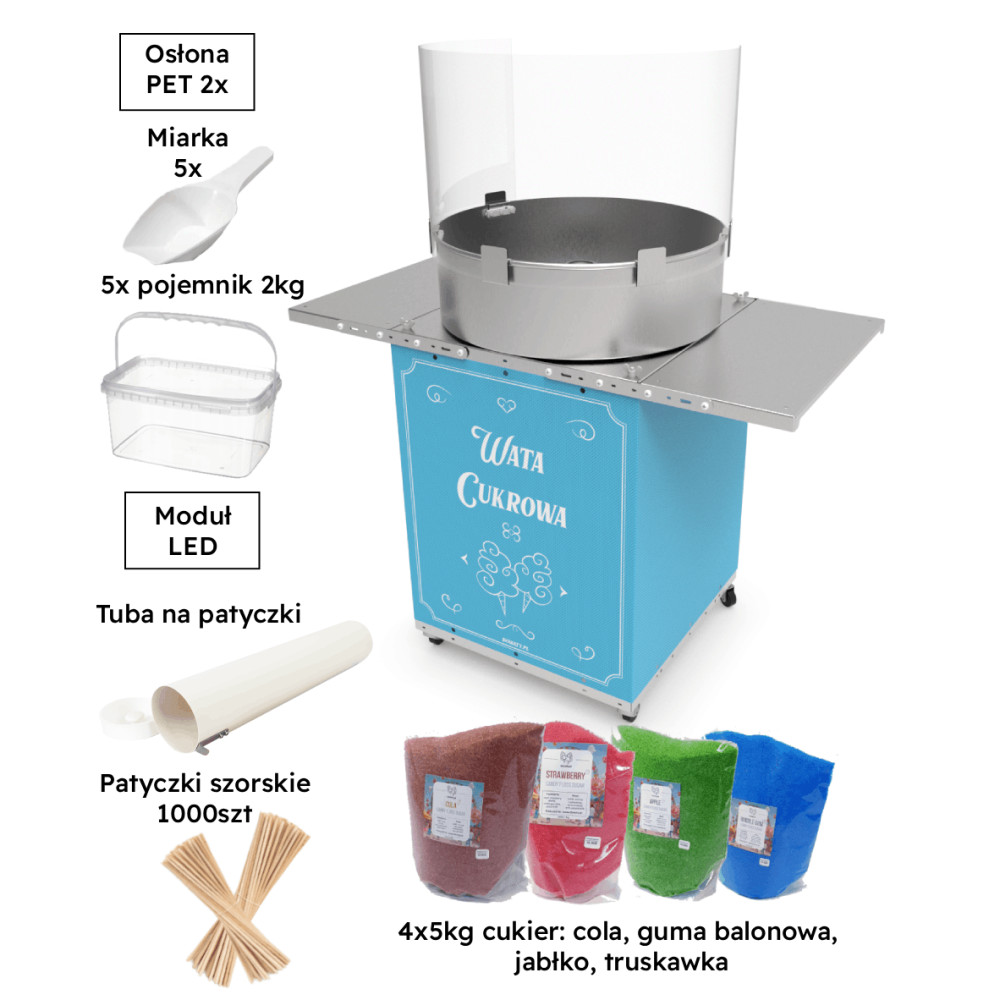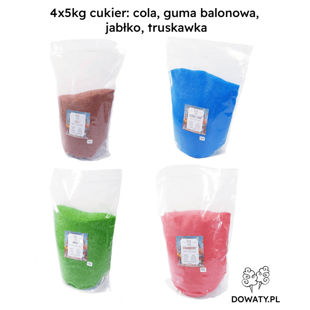 - 20 kg cukru (4x 5 kg): Wysokiej jakości cukier do produkcji kolorowej waty.