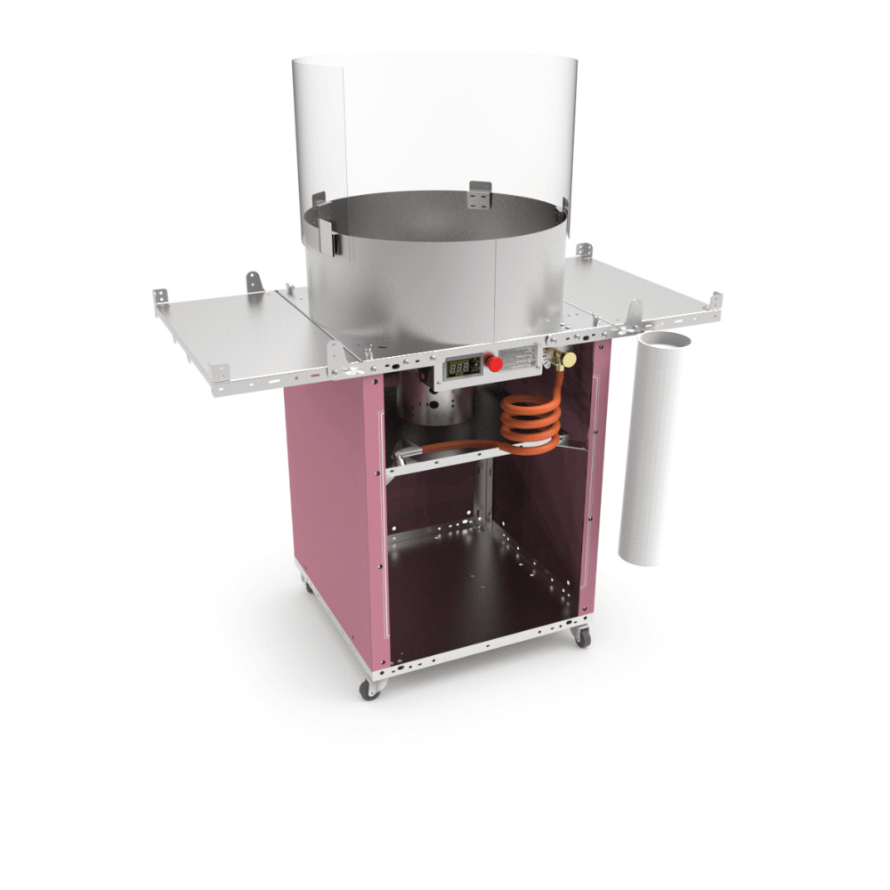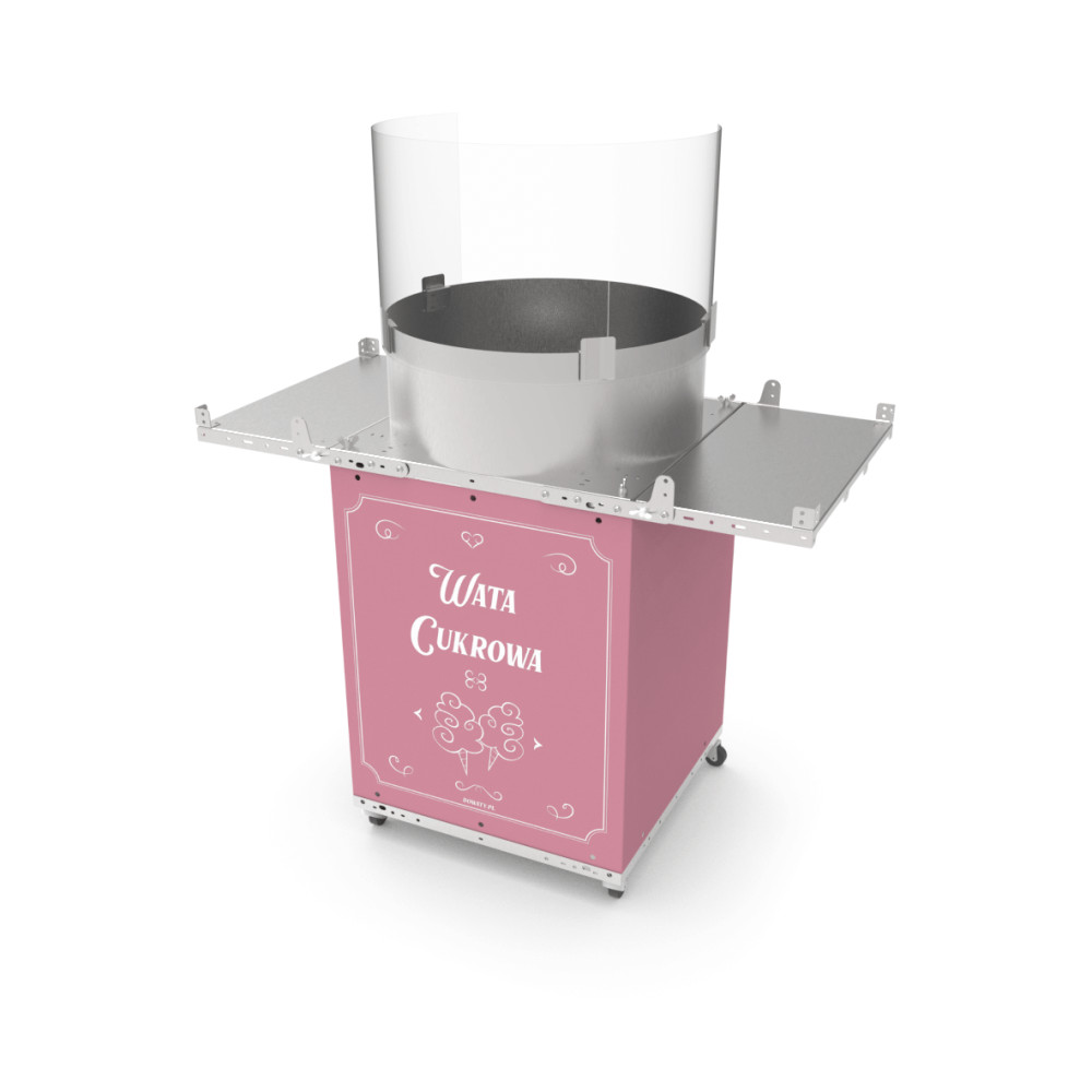 Wolnostojąca maszyna do waty cukrowej w stylu retro, w kolorze różowym. Niezwykle stylowy design nawiązujący do lat 50 i 60 ubiegłego wieku. Konstrukcja w pełni składana przy pomocy jednego śrubokręta, lekka, posiada aż 4 półki i cieszy się ogromną popularnością na rynku.