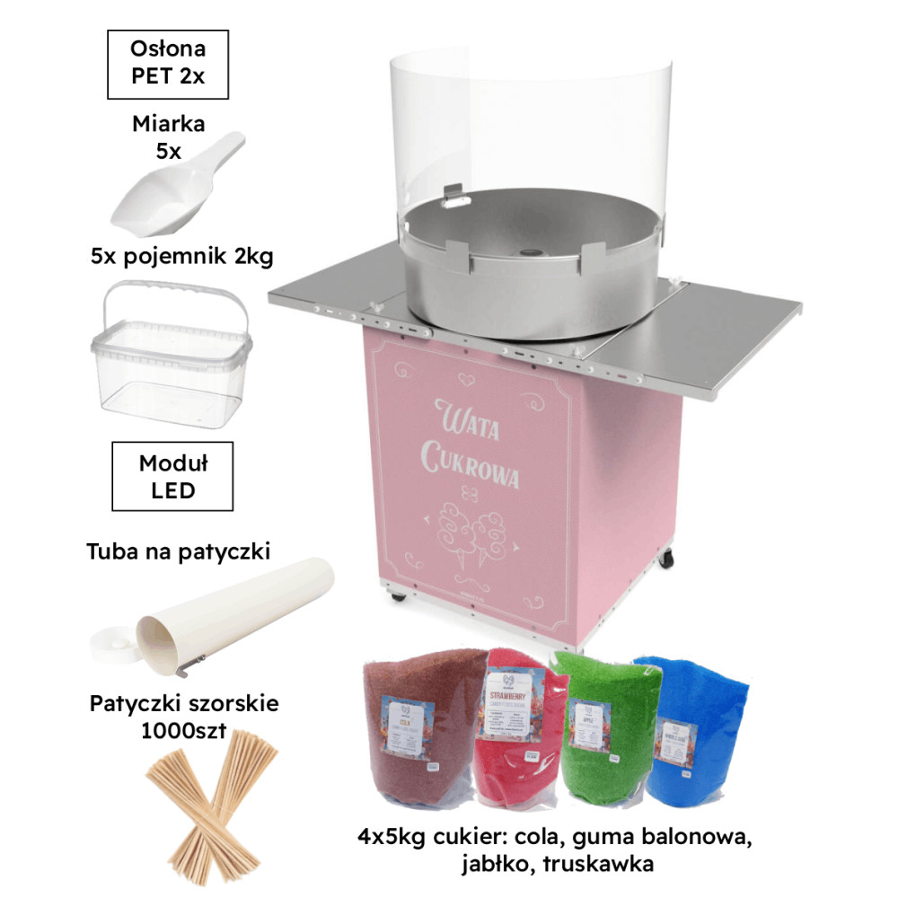- 20 kg cukru (4x 5 kg): Wysokiej jakości cukier do produkcji kolorowej waty